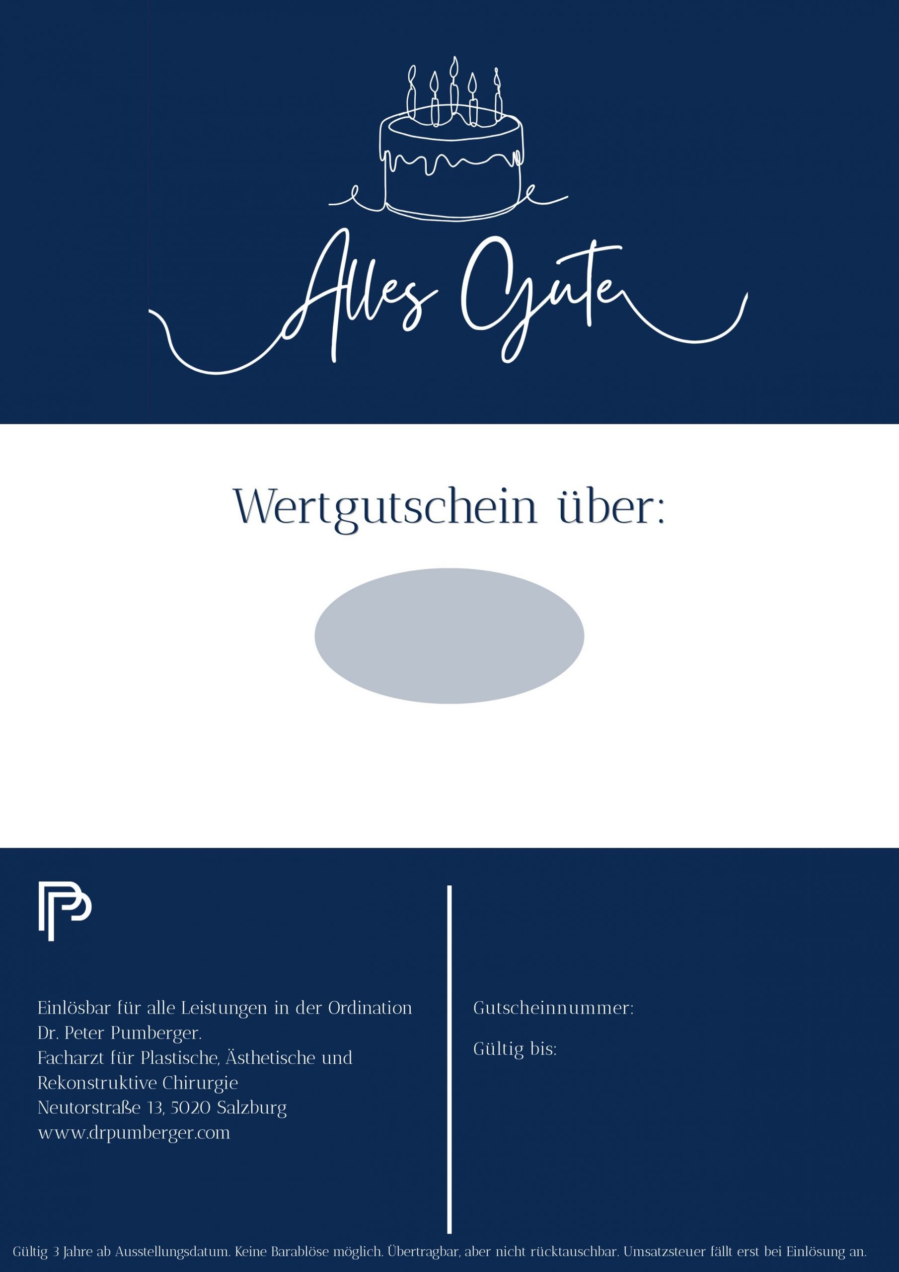 Das perfekte Geburtstagsgeschenk! Der Wertgutschein für alle Leistungen von Dr. Pumberger lässt dem Geburtstagskind die freie Wahl – flexibel, persönlich und immer passend.