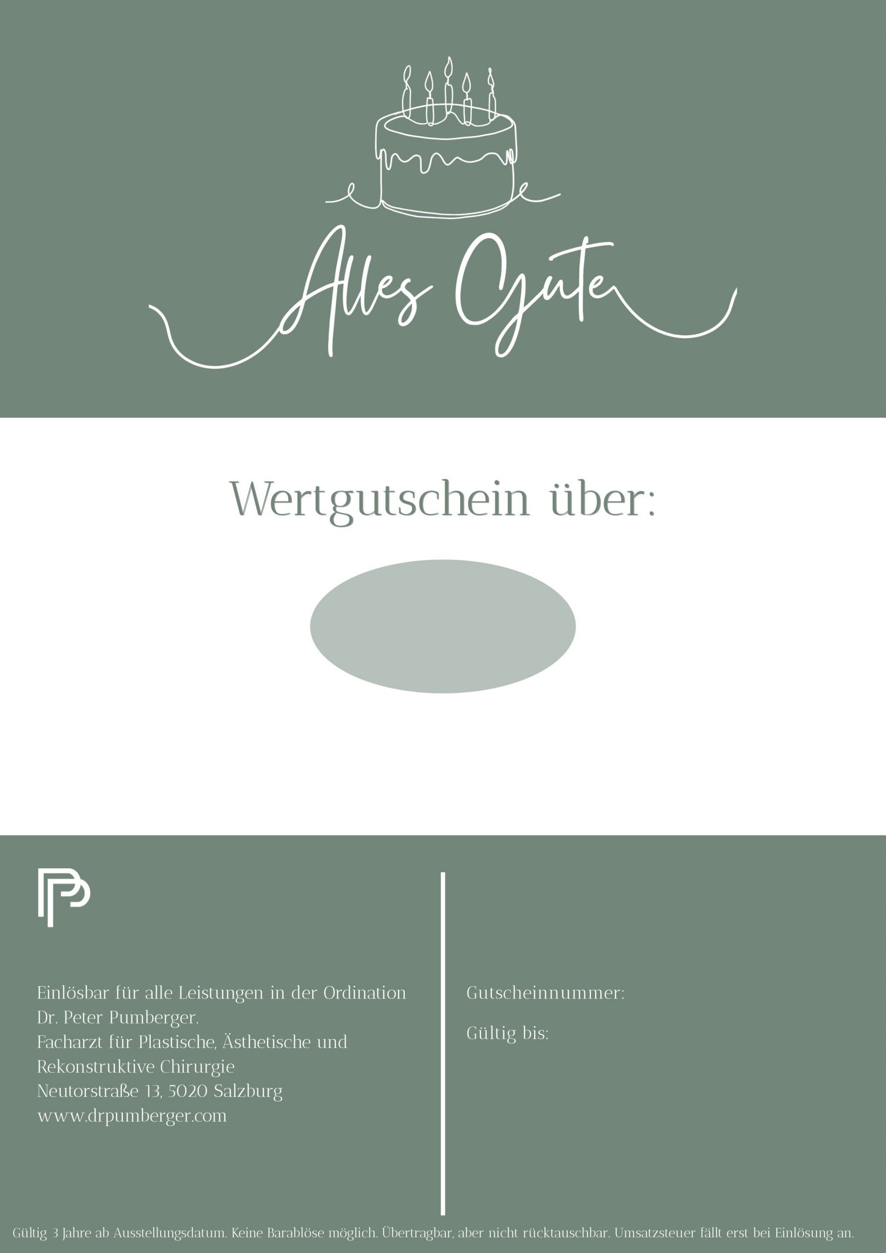 Das perfekte Geburtstagsgeschenk! Der Wertgutschein für alle Leistungen von Dr. Pumberger lässt dem Geburtstagskind die freie Wahl – flexibel, persönlich und immer passend.