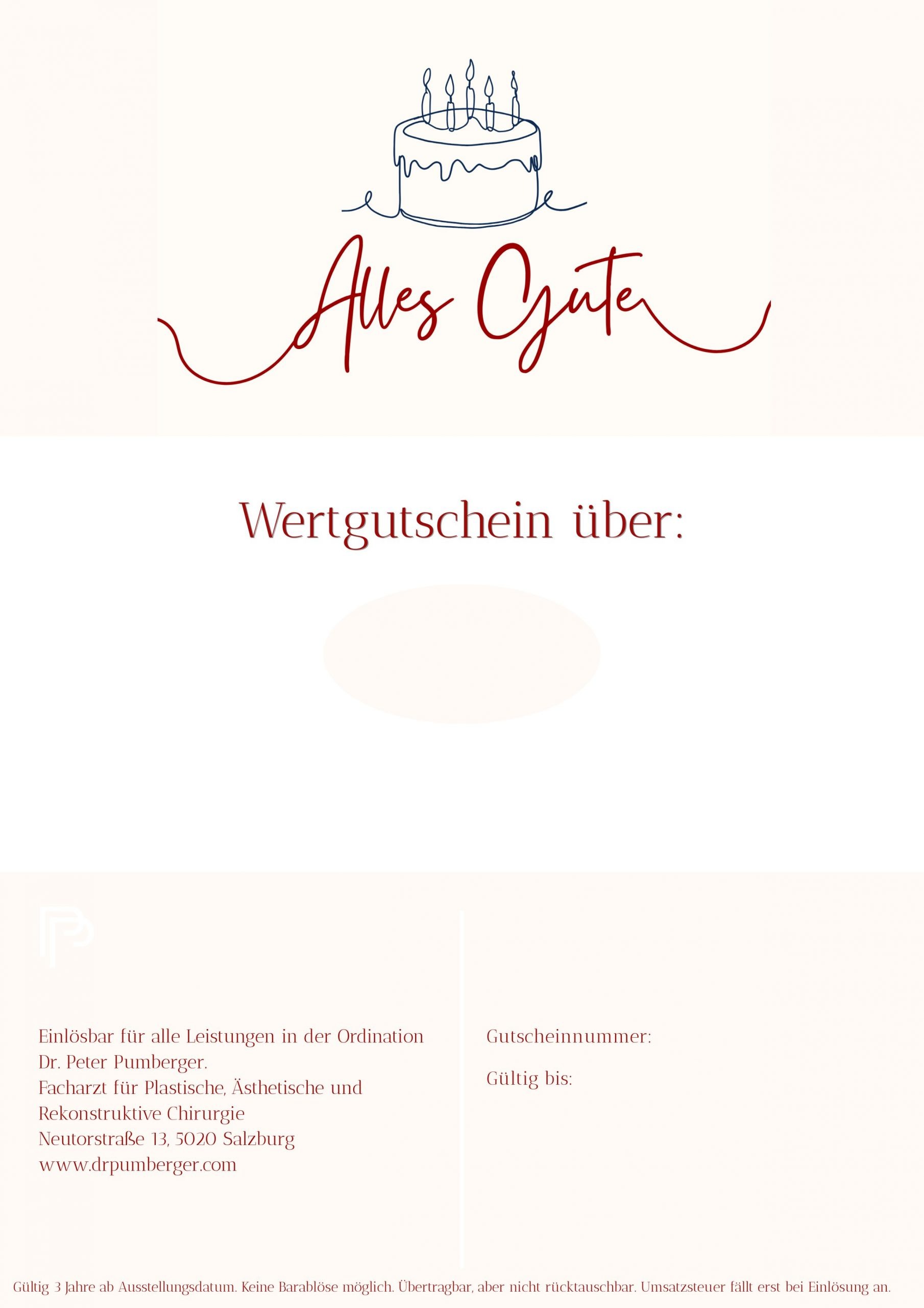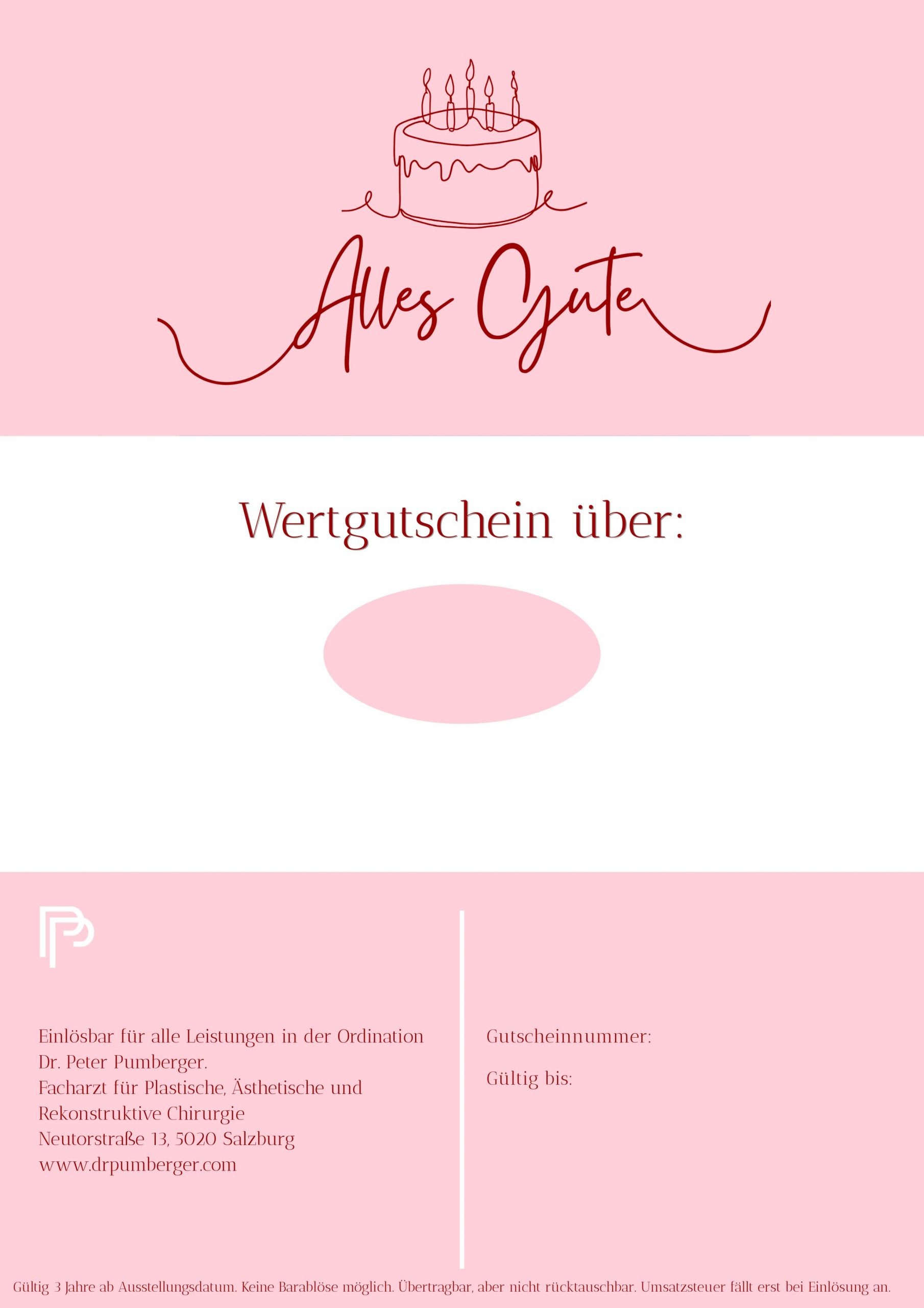 Das perfekte Geburtstagsgeschenk! Der Wertgutschein für alle Leistungen von Dr. Pumberger lässt dem Geburtstagskind die freie Wahl – flexibel, persönlich und immer passend.
